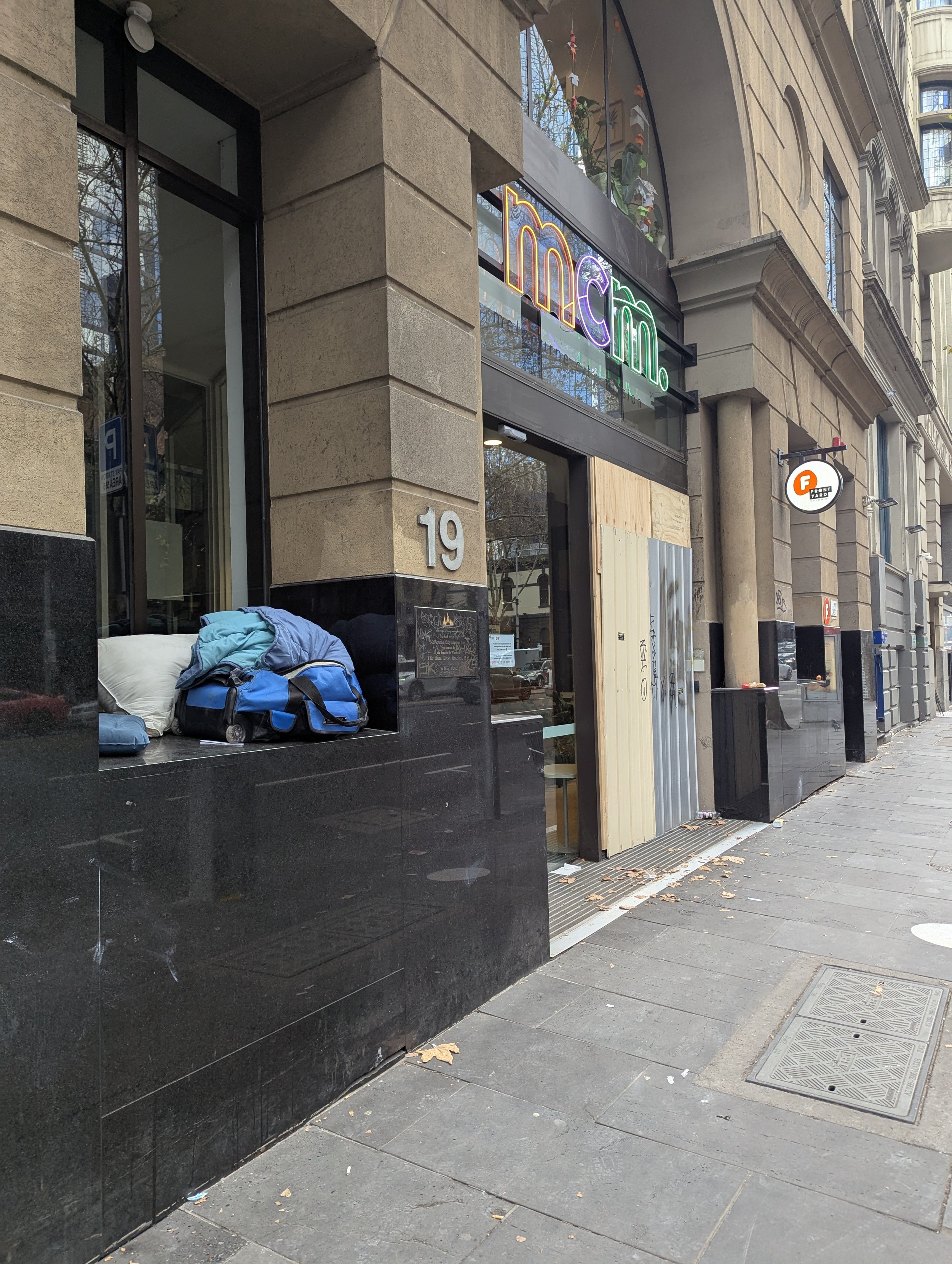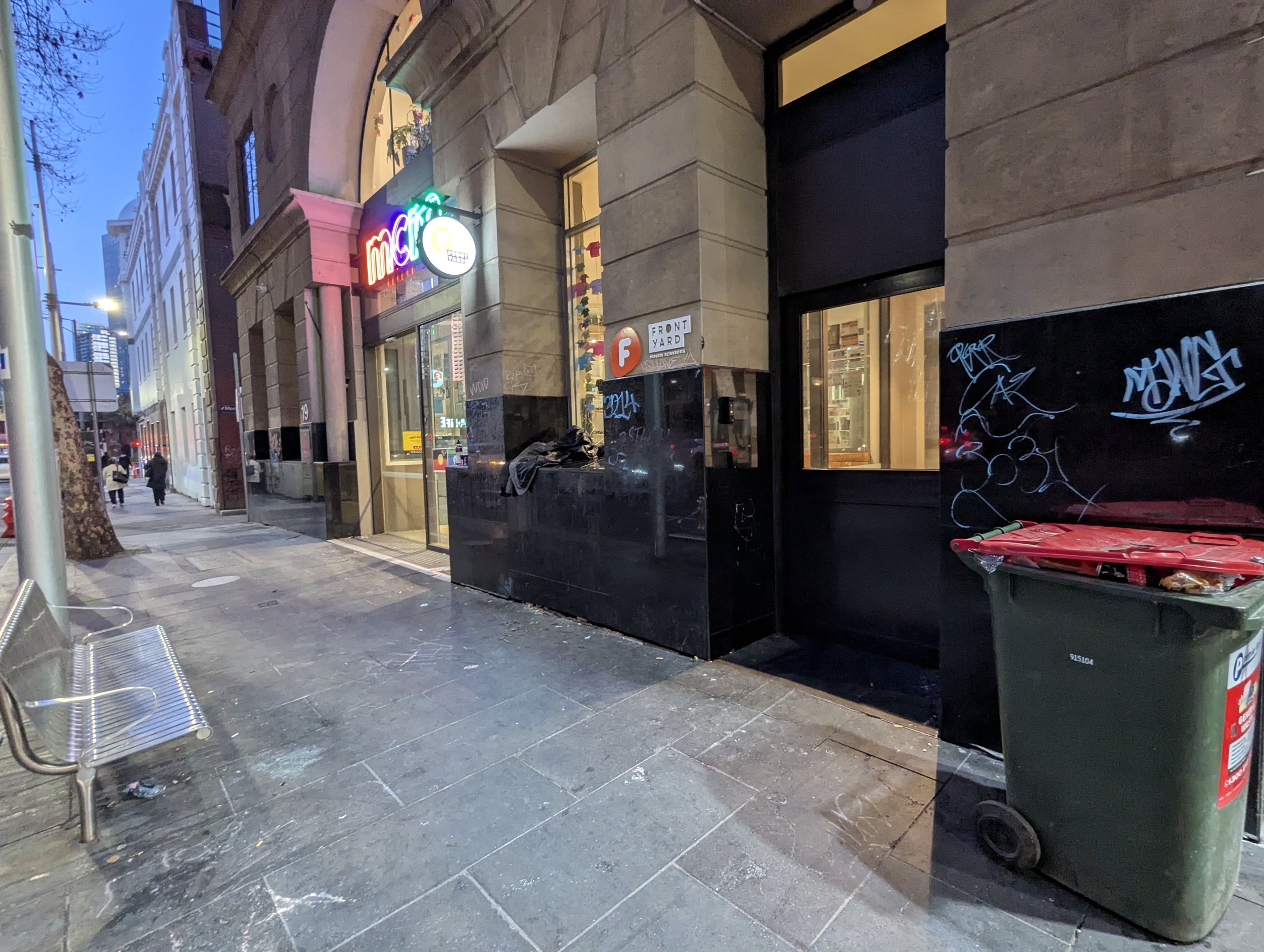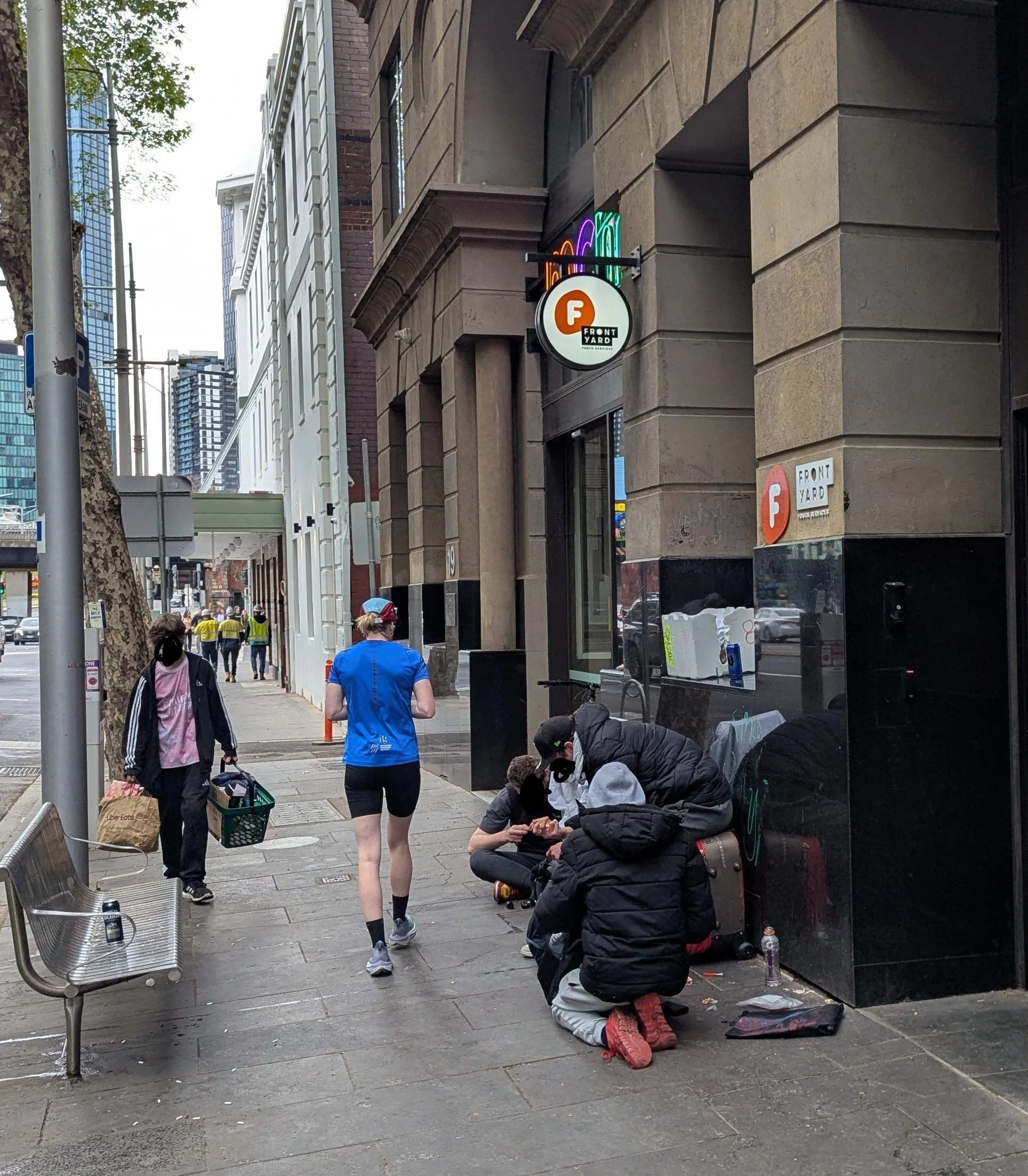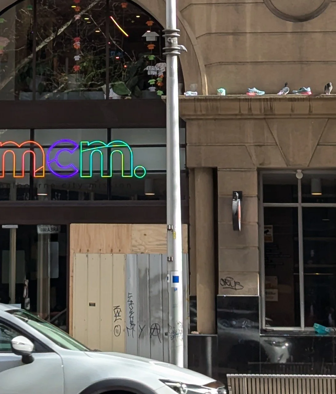 This website is an independent photographic documentation of the public environment in and around King Street (South end), Melbourne CBD. It is not affiliated with, endorsed by, or associated with Melbourne City Mission (MCM), Frontyard Youth Services, or any other organisations. Any incidental appearance of their premises, signage, staff, or clients occurs solely in the context of documenting the public streetscape and does not constitute commentary, representation, or implication regarding those organisations or the individuals depicted.